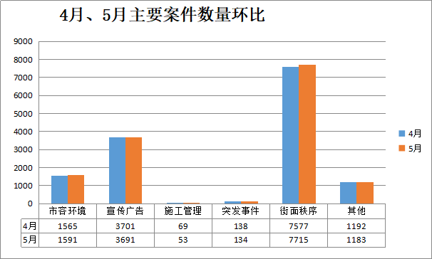 案件类别 | 5月(宗) | 4月(宗) | 增/减(宗) | 结案数(宗) | 结案率(%) | 案件主要类型 |