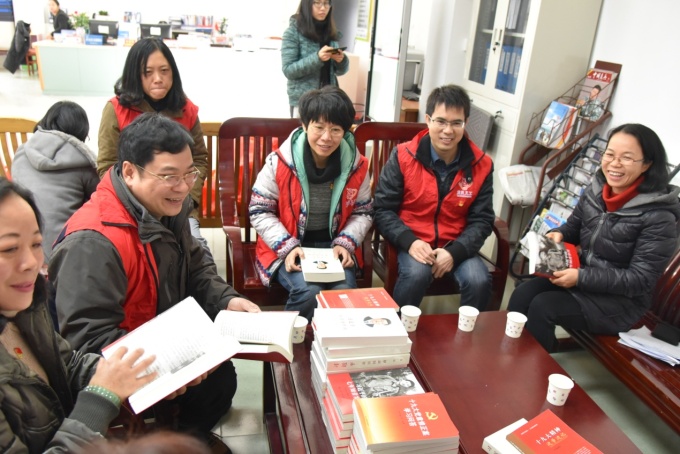 为进一步把党的十九大精神宣传好、贯彻好,充分发挥党员干部服务基层、服务群众的积极作用,在春节来临之际,江门市财政局机关党委各党支部党员携带十九大系列图书分别走进圩顶社区、复兴社区、蓬莱社区、中沙社区、新中社区,送到社区工作人员手中,把十九大精神送进社区,让党的十九大精神在基层落地生根。并与社区开展一系列春节慰问党员及“迎新春送春联”活动。