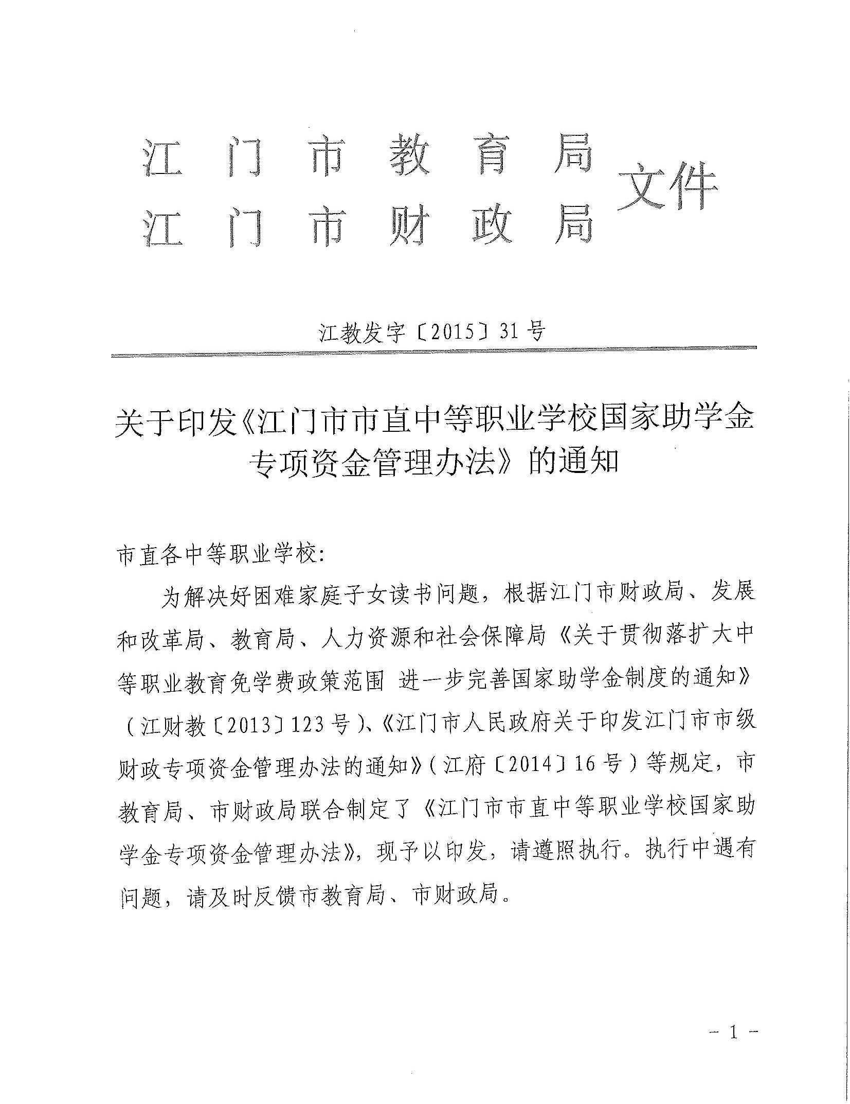 关于印发《江门市市直中等职业学校国家助学金专项资金管理办法》的通知