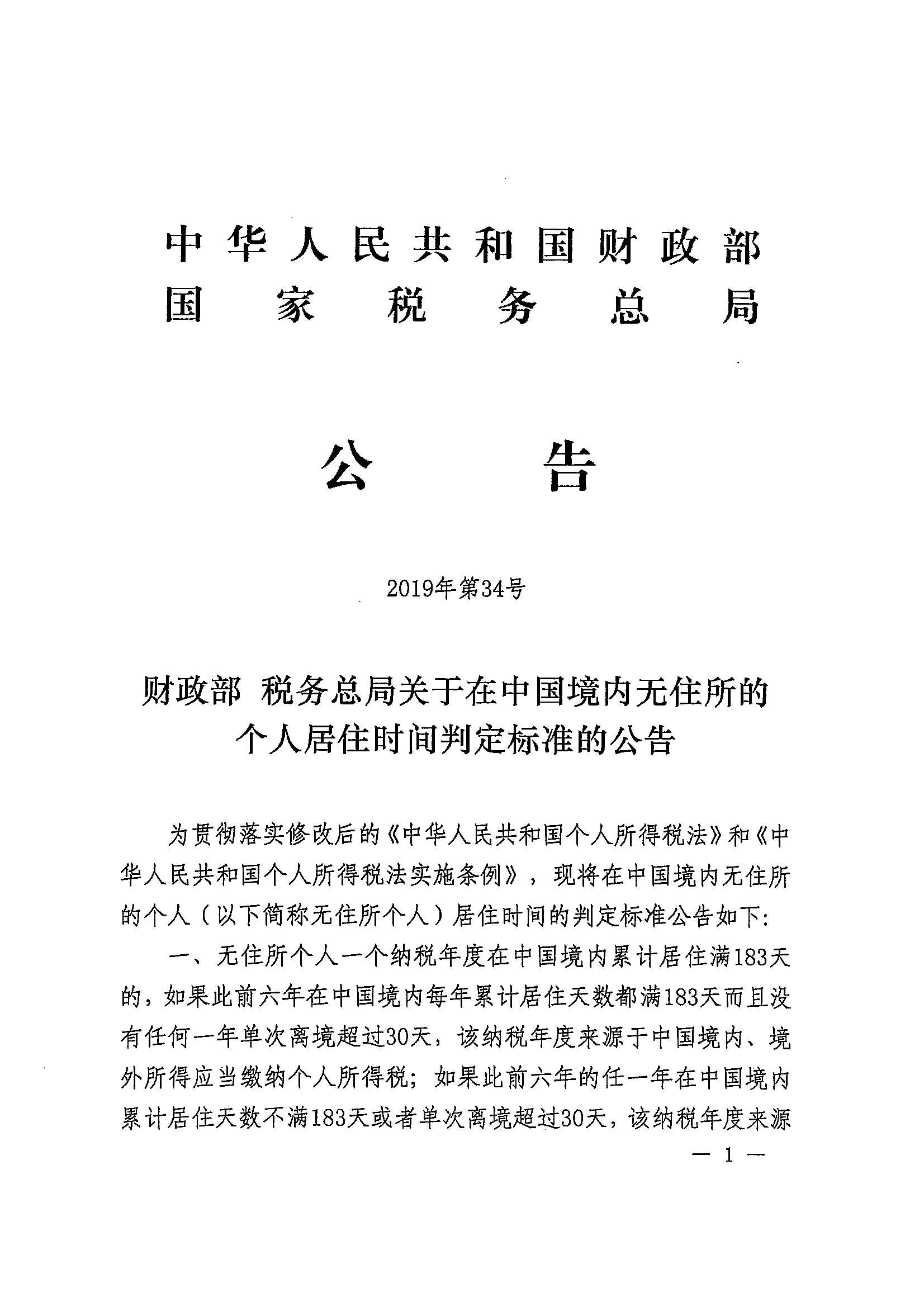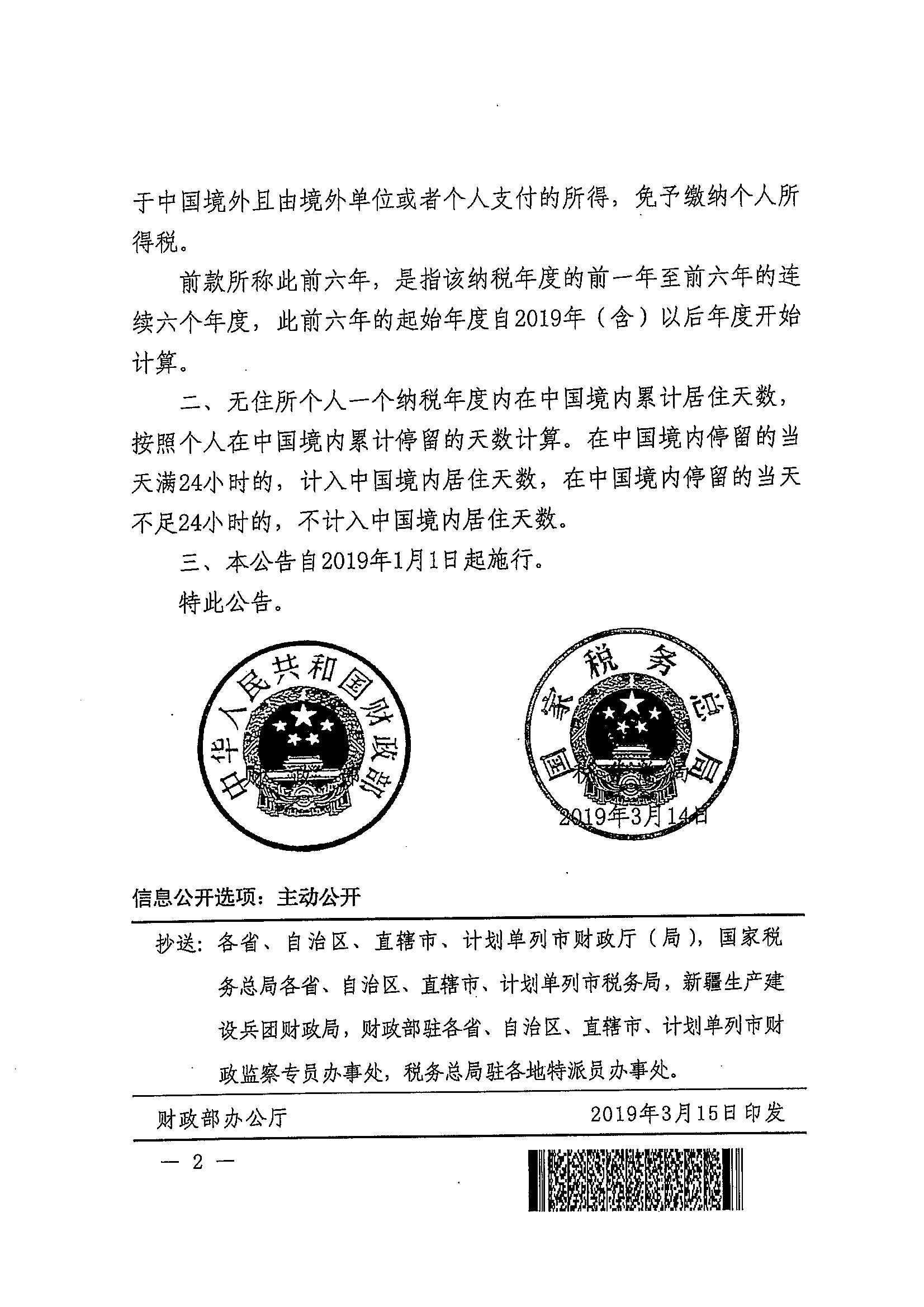 财政部 税务总局关于在中国境内无住所的个人居住时间判定标准的公告