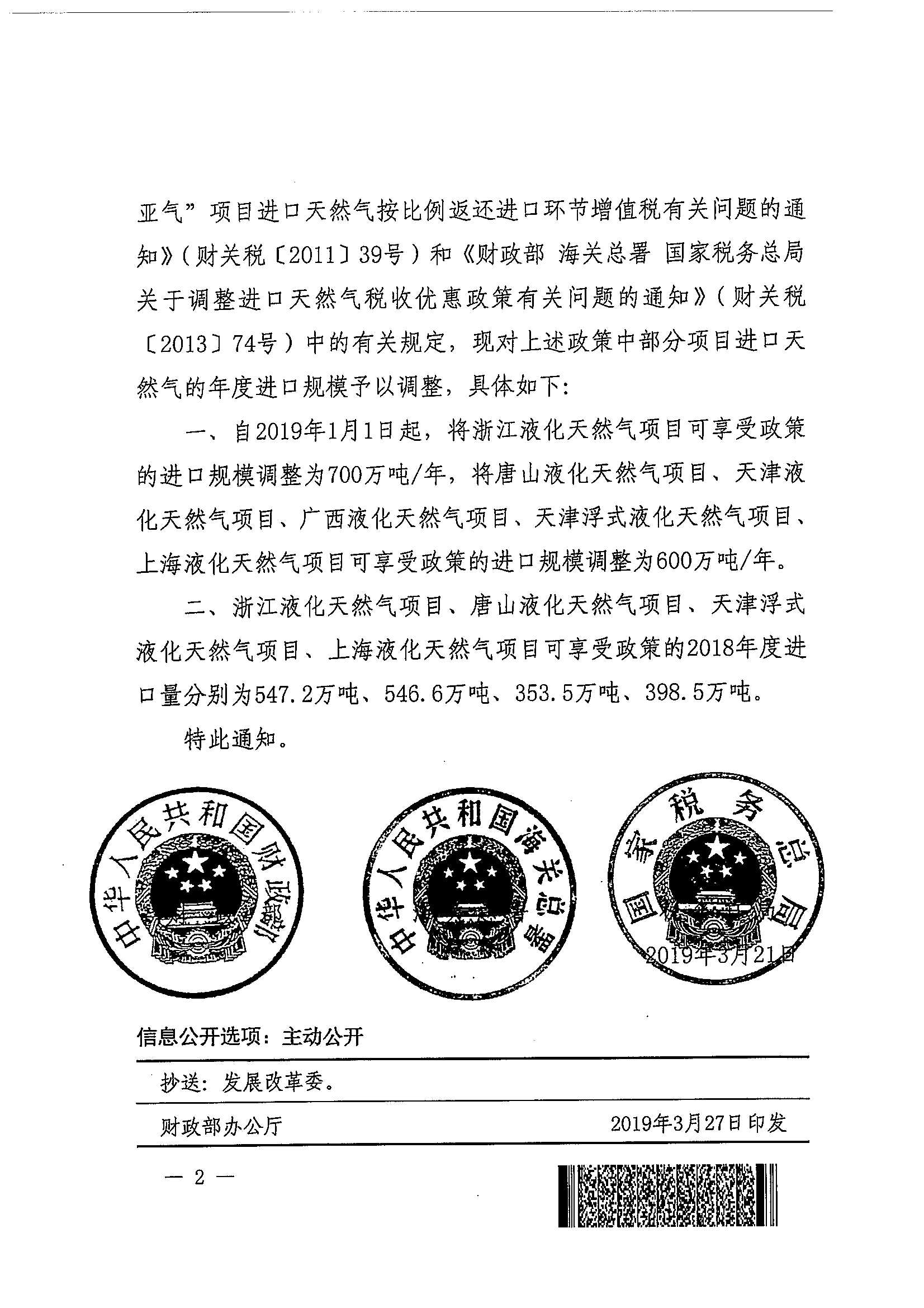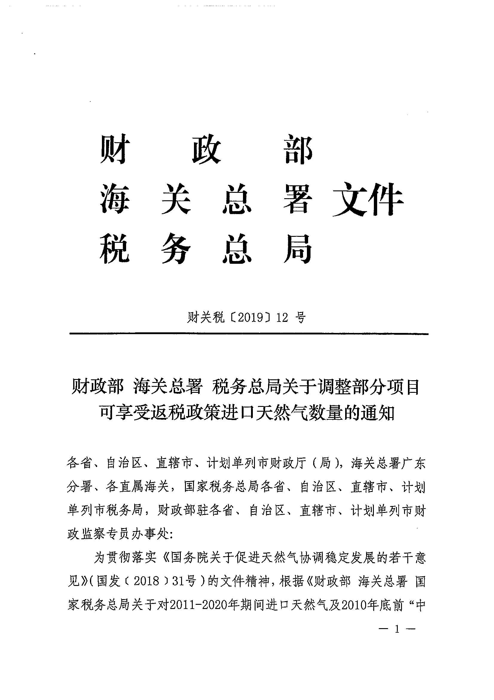 财政部 海关总署 税务总局关于调整部分项目可享受返税政策进口天然气数量的通知