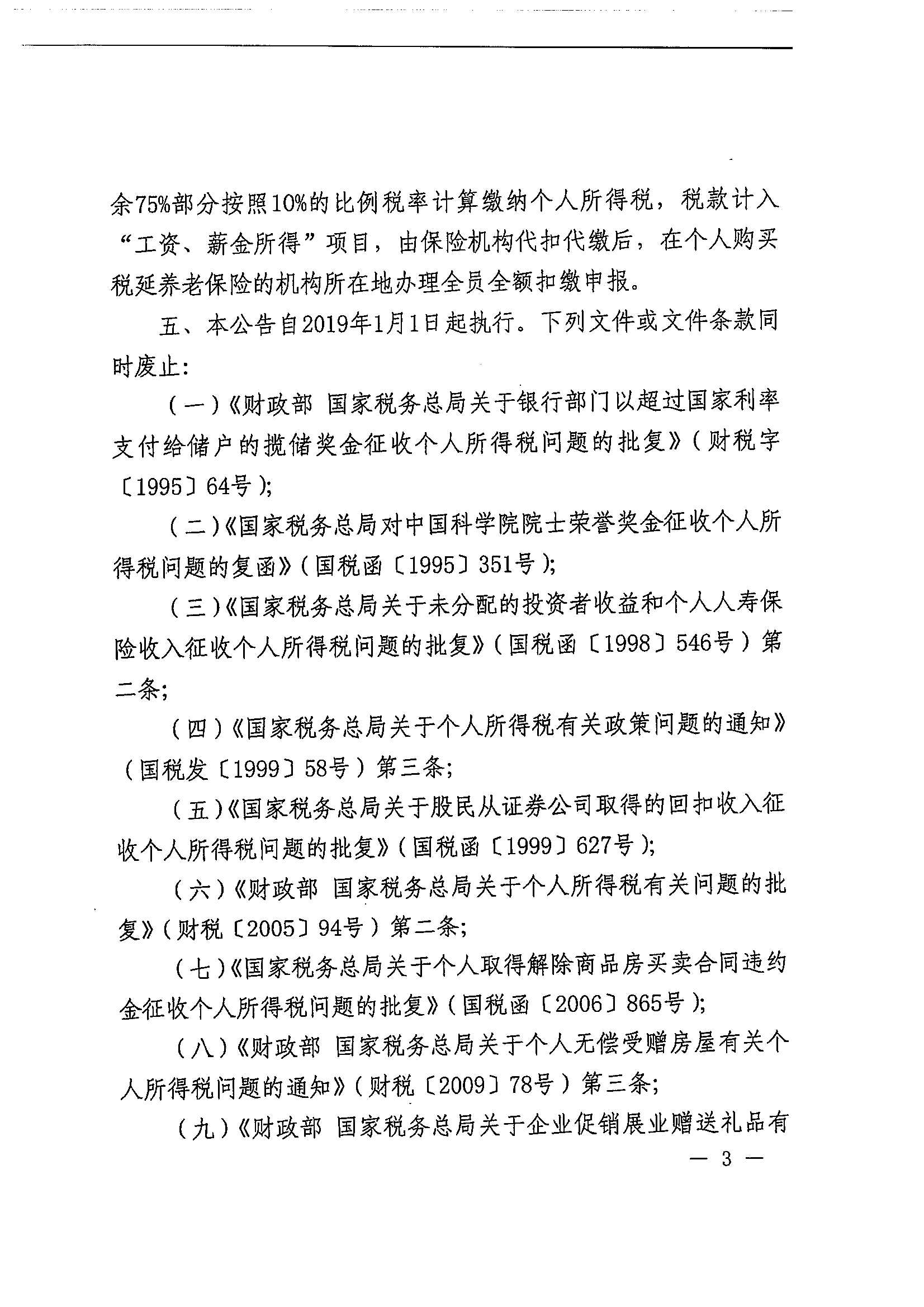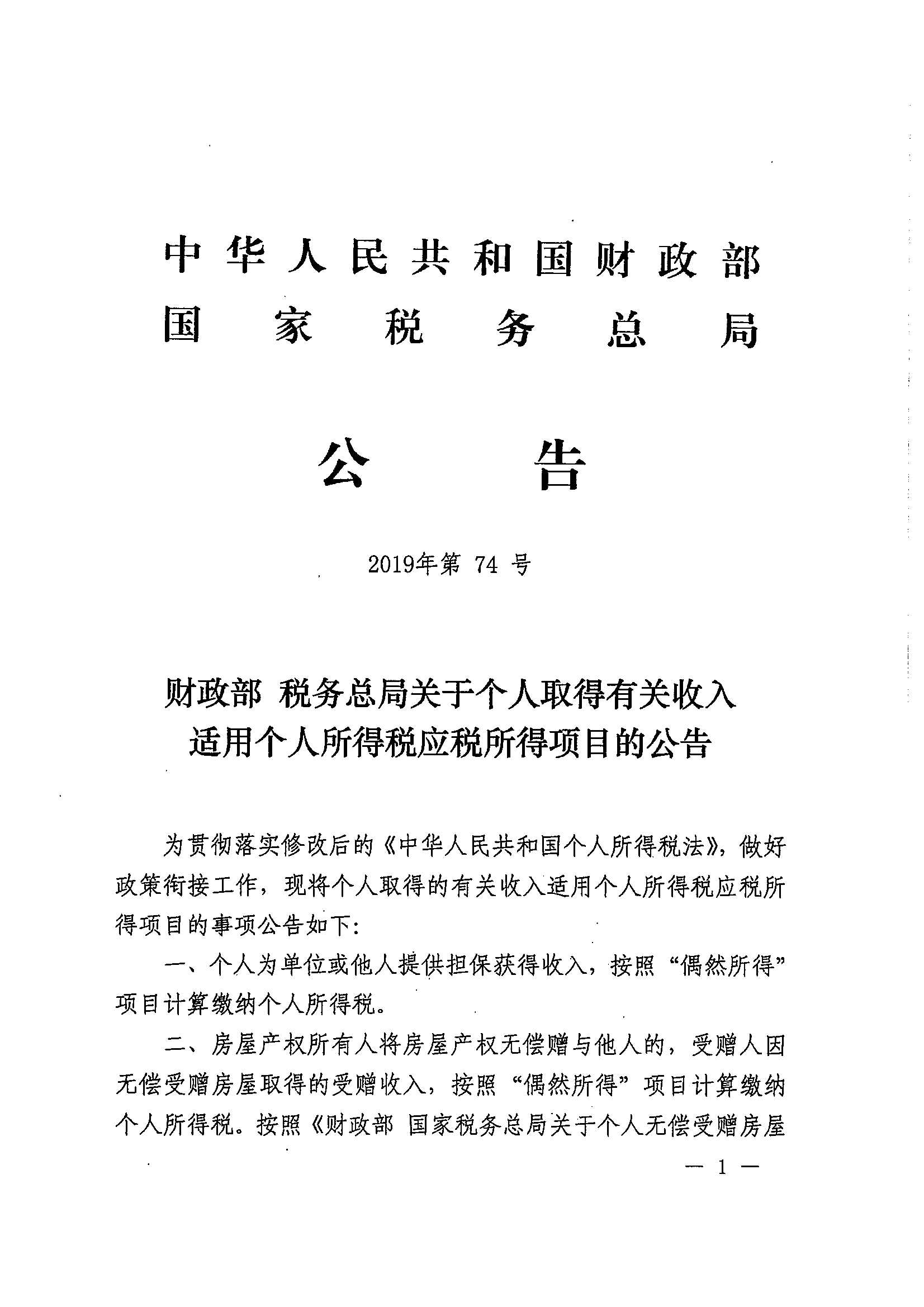 财政部 税务总局关于个人取得有关收入适用个人所得税应税所得项目的公告