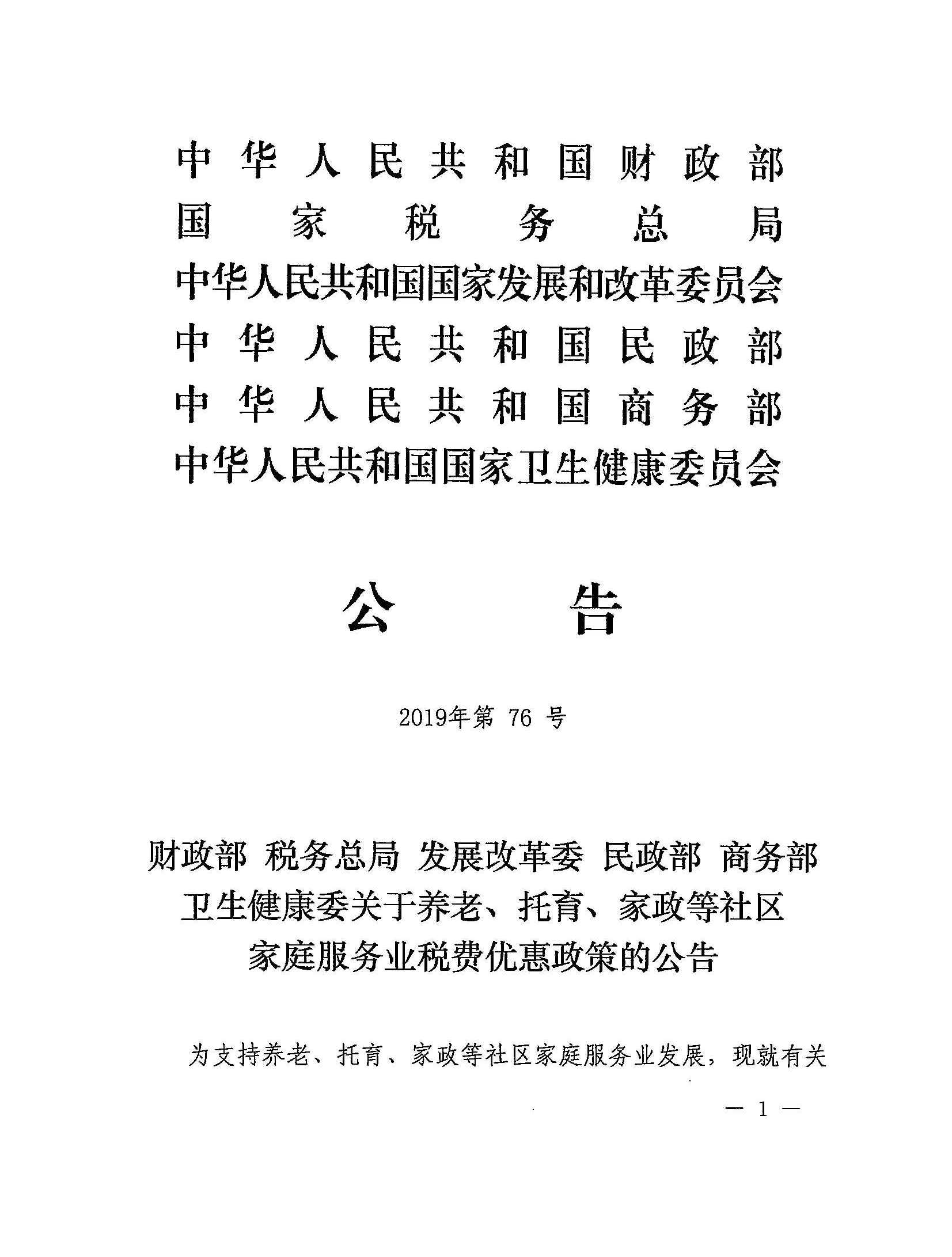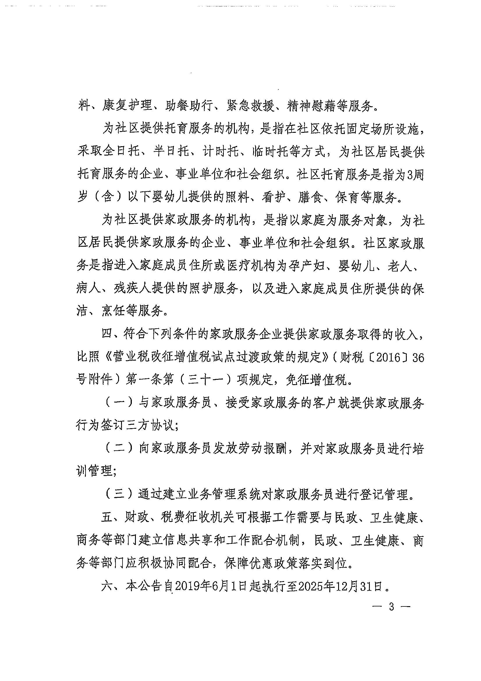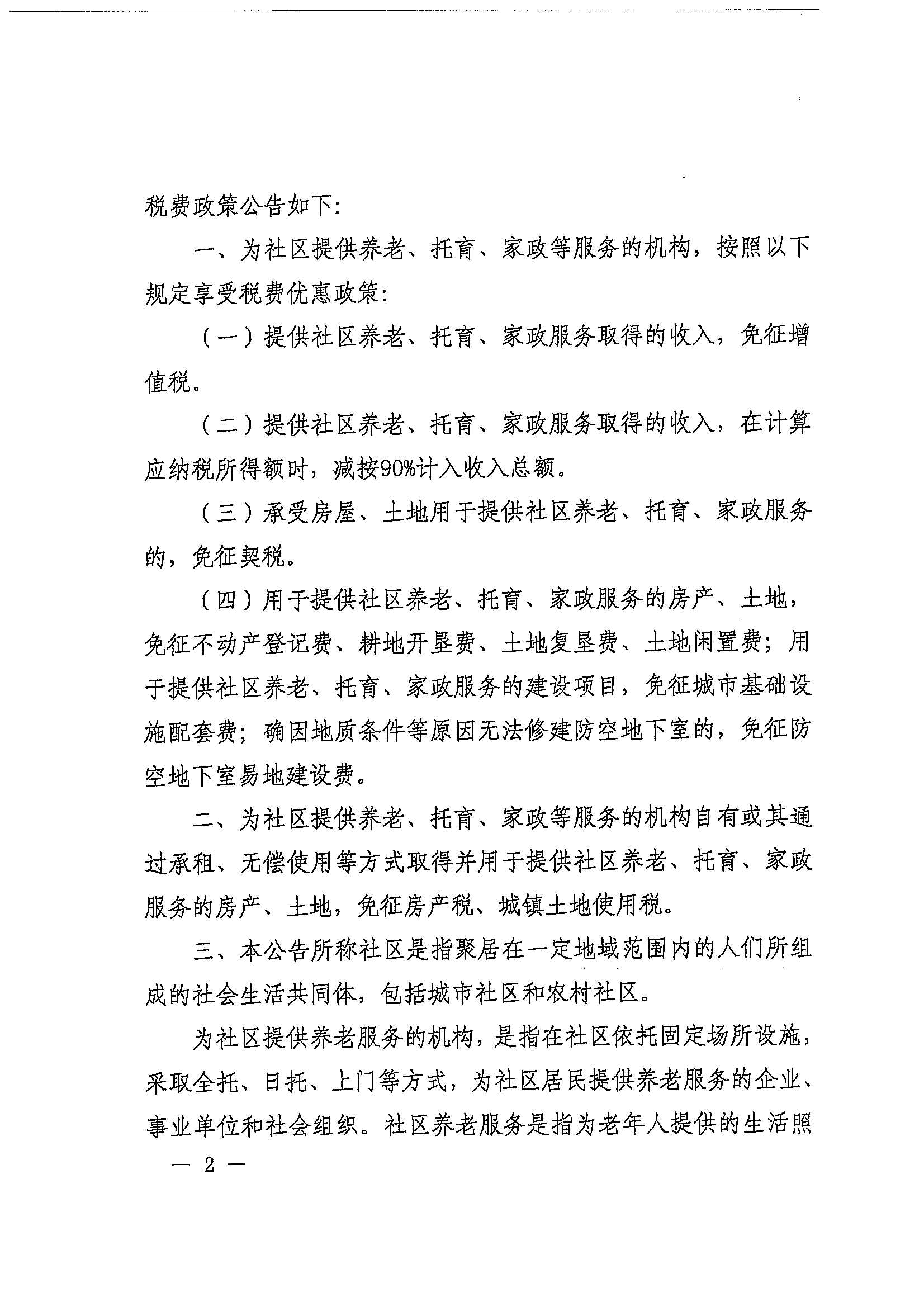 财政部 税务总局 发展改革委 民政部 商务部 卫生健康委关于养老、托育、家政等社区家庭服务业税费优惠政策的公告