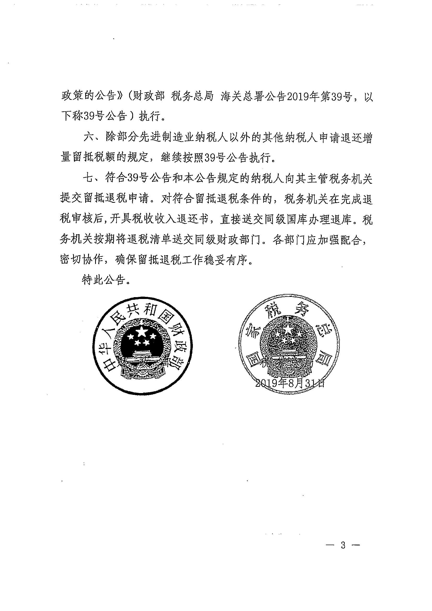 财政部 税务总局关于明确部分先进制造业增值税期未留抵退税政策的公告