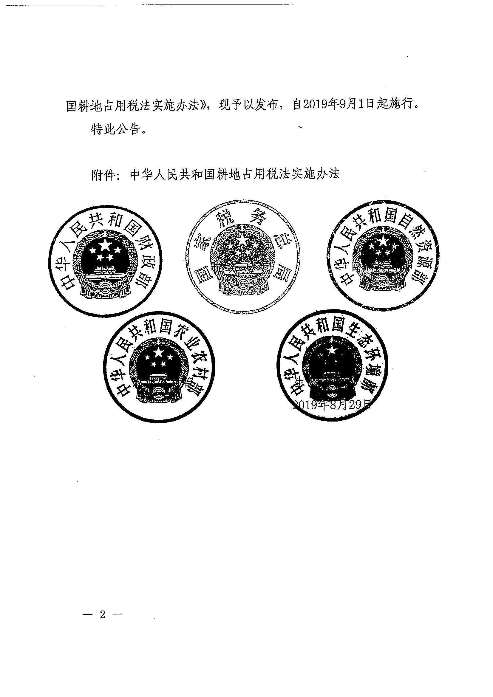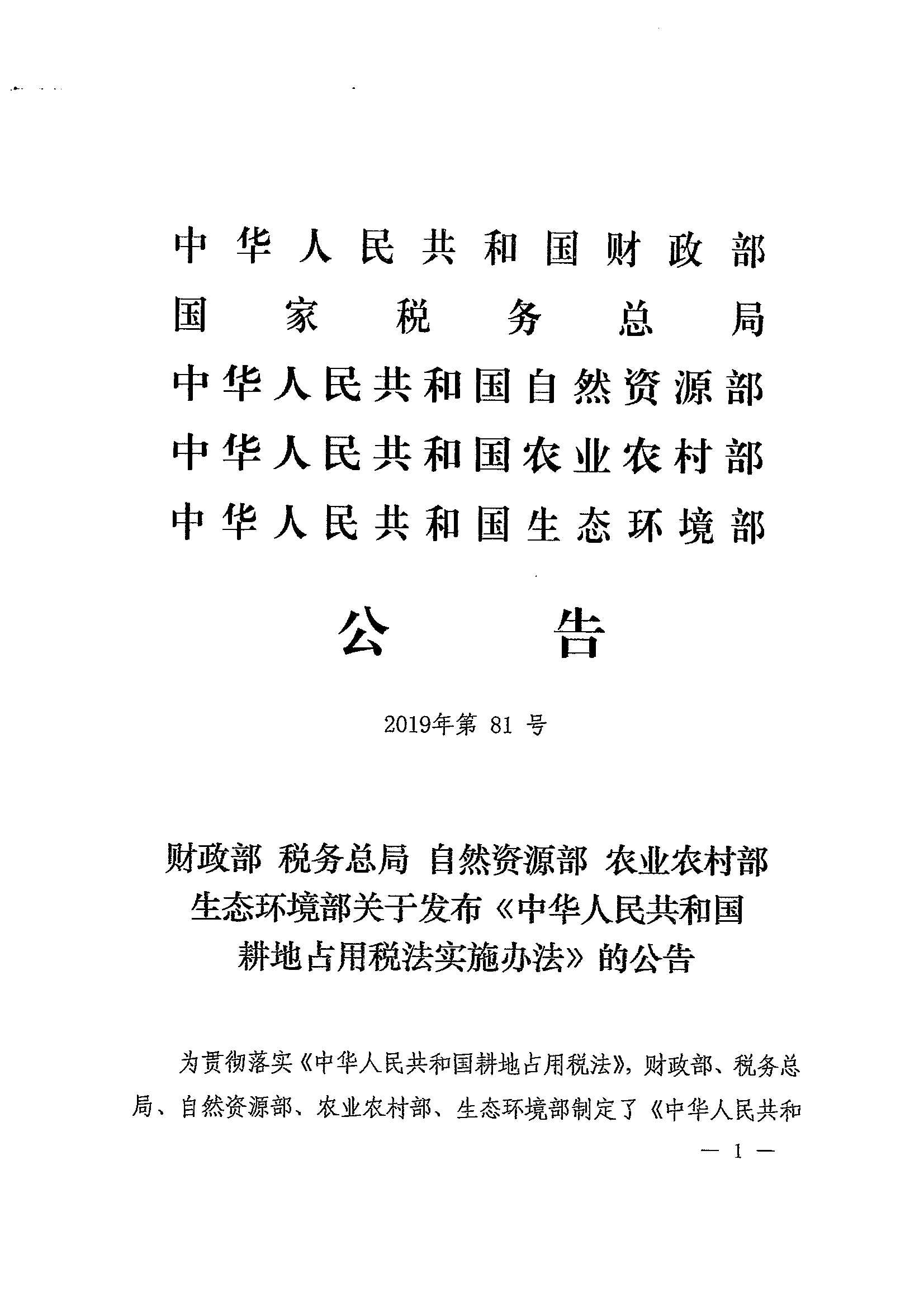 财政部 税务总局 自然资源部 农业农村部 生态环境部关于发布《中华人民共和国耕地占用税法实施办法》的公告