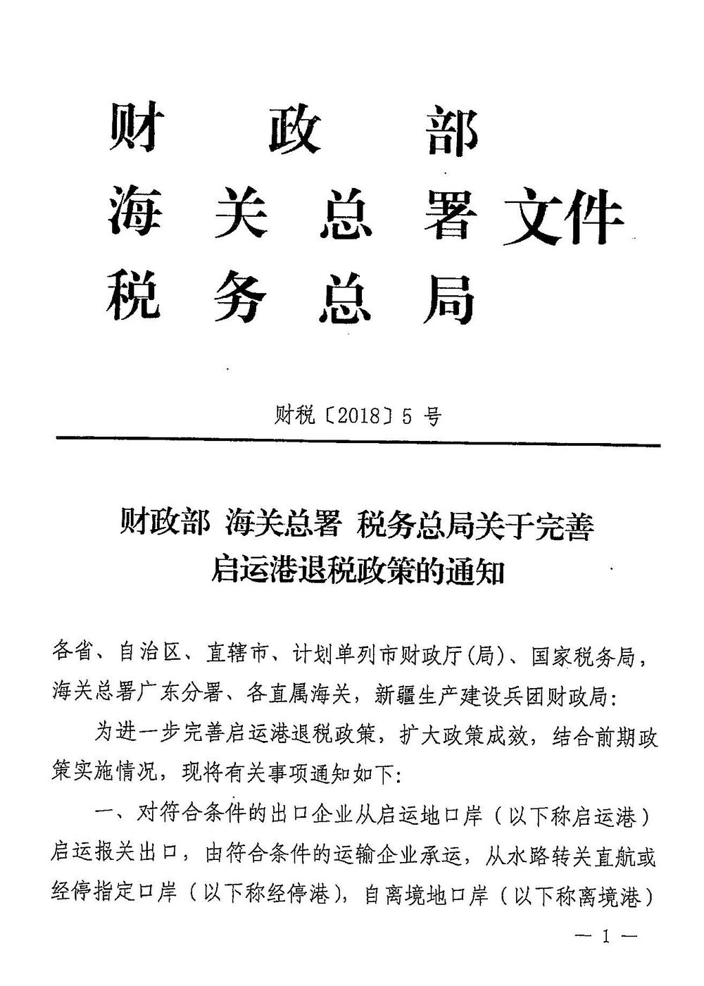 财政部 海关总署 税务总局关于完善启运港退税政策的通知