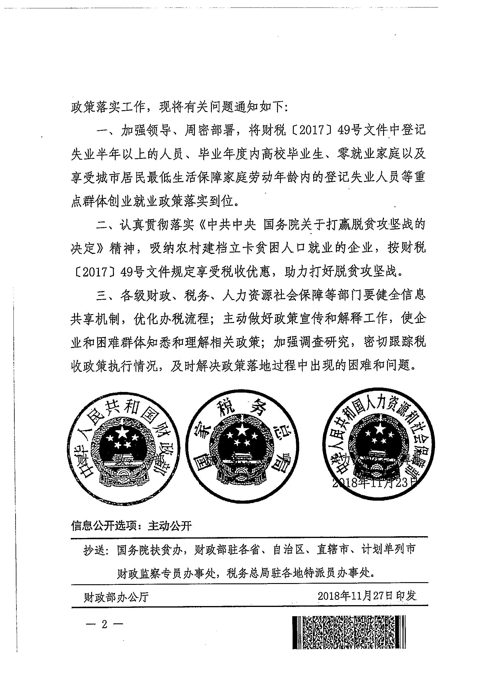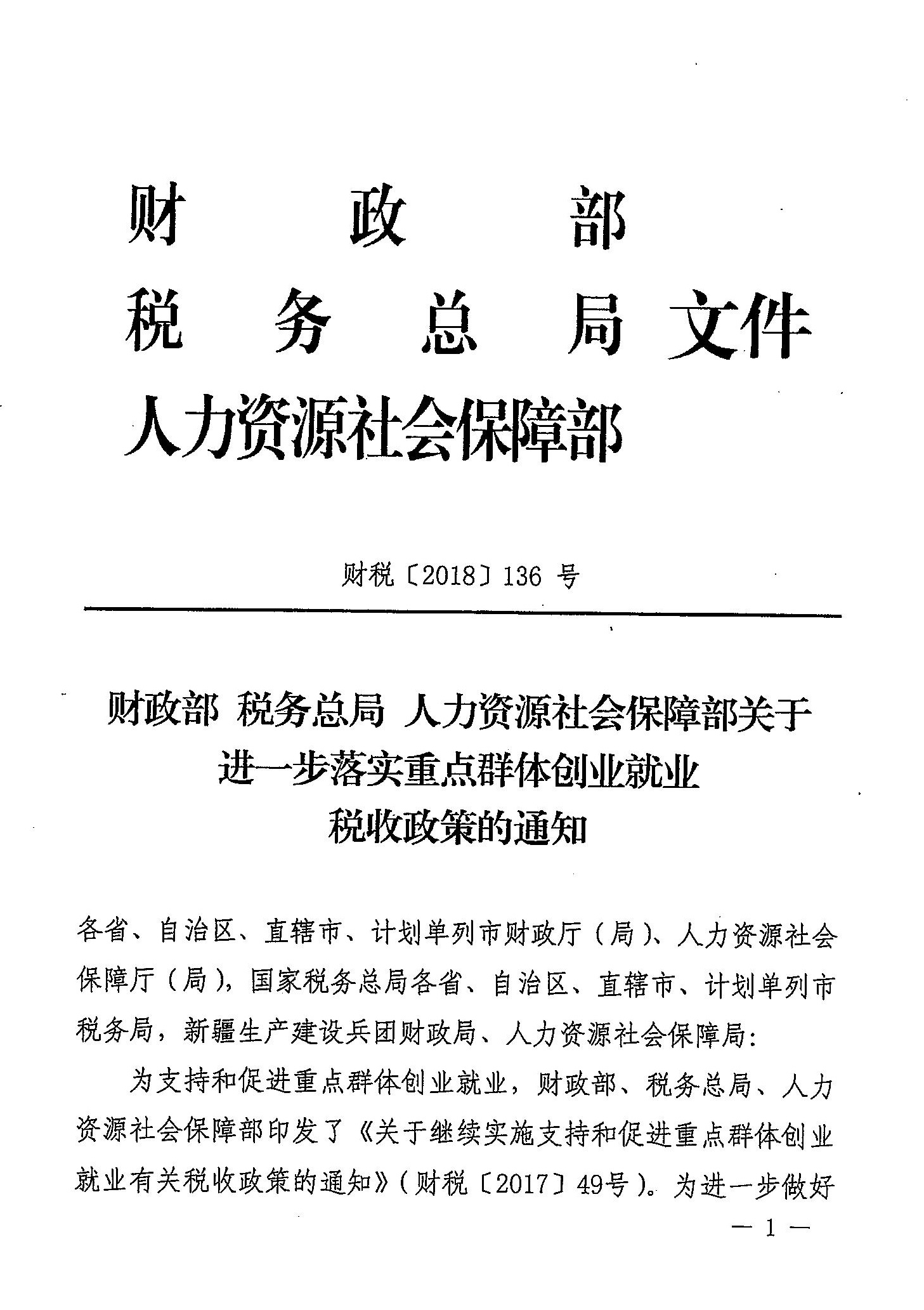 财政部 税务总局 人力资源社会保障部关于进一步落实重点群体创业就业税收政策的通知