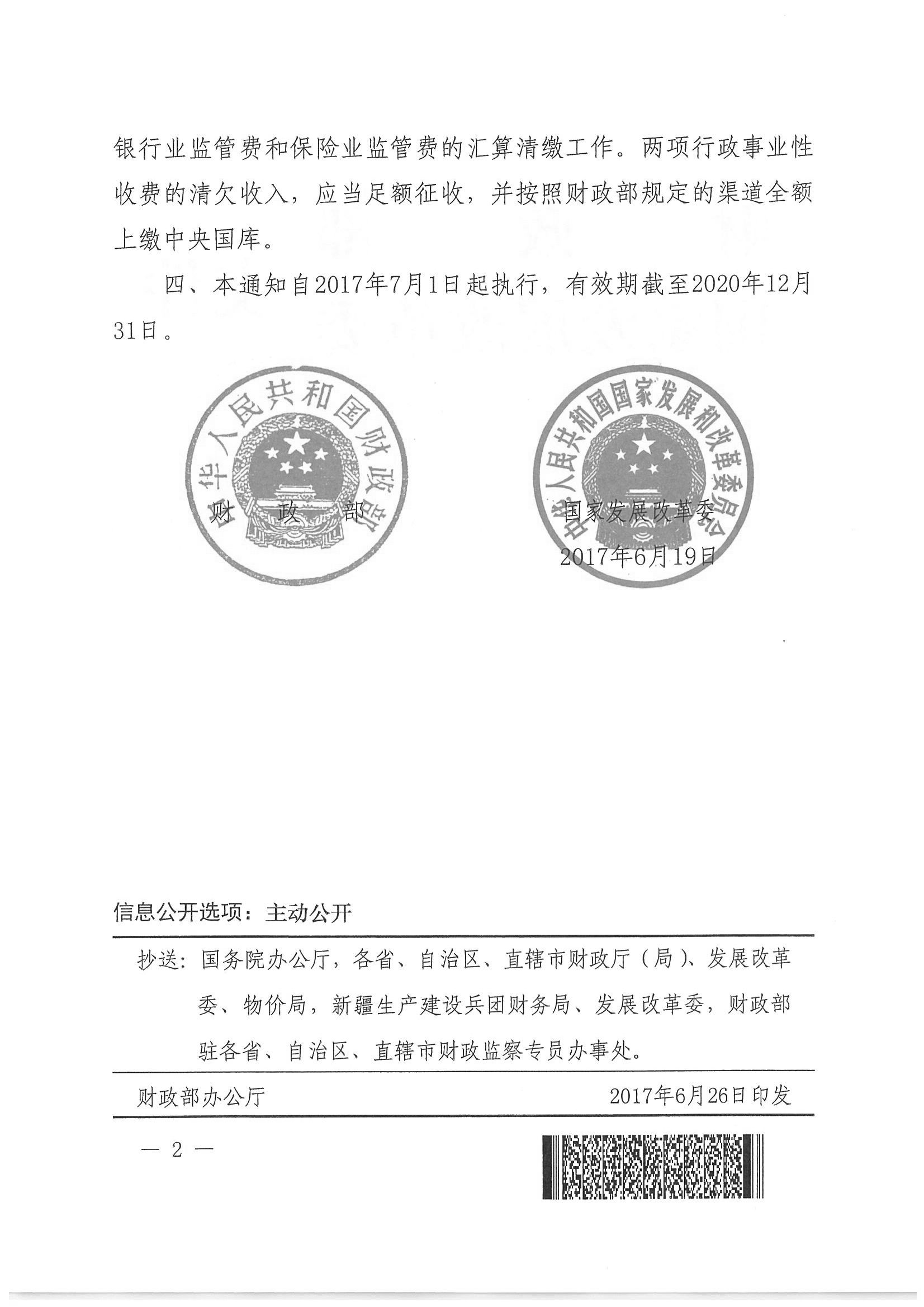 财政部 国家发展改革委关于暂 免征银行业监管费和保险业监管费的通知