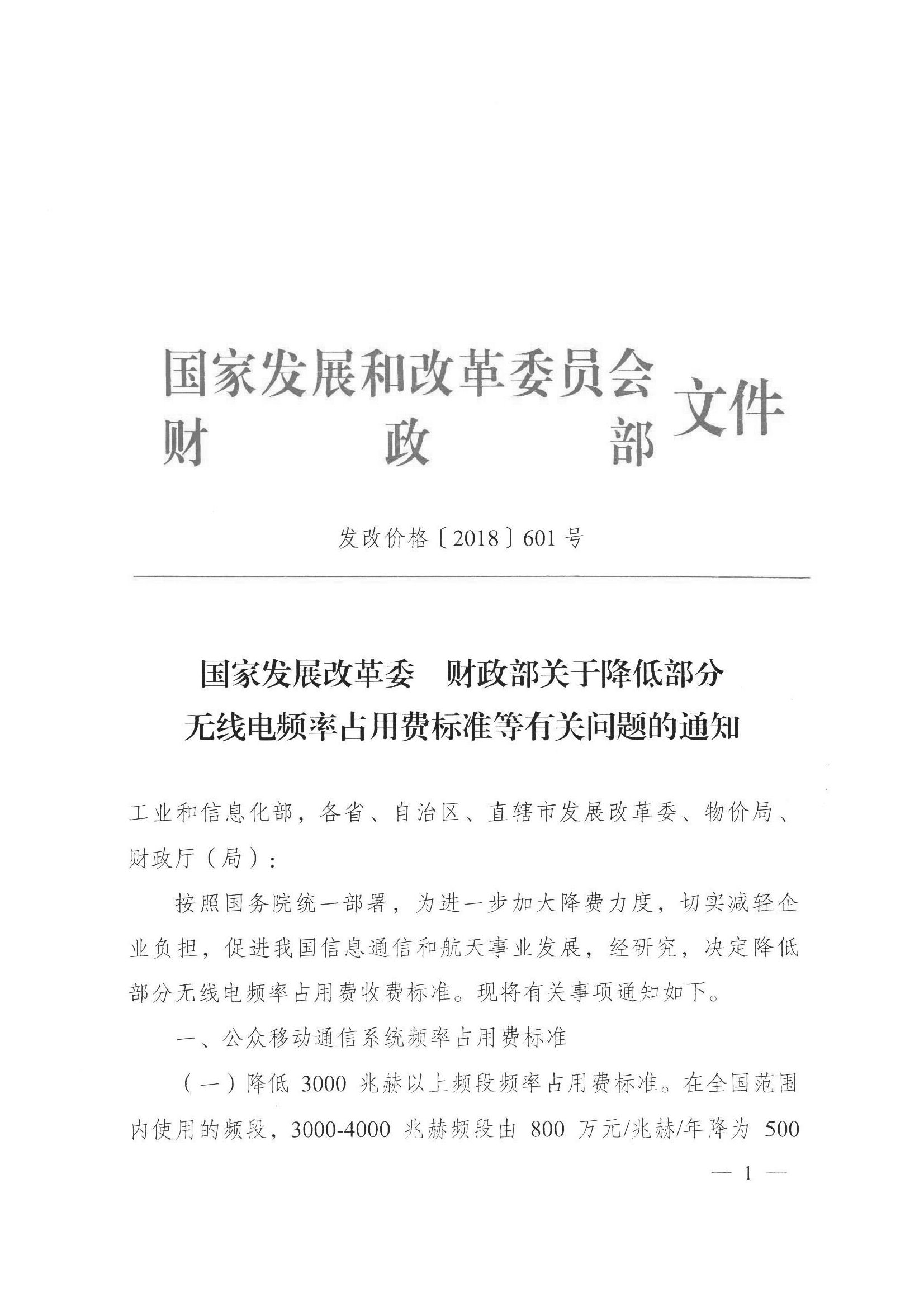 国家发展改革委 财政部关于 降低部分无线电频率占用费标准等有关问题的通知
