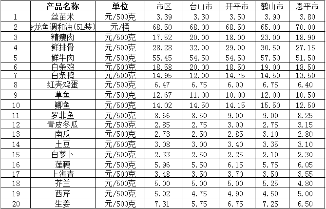 说明:1、表中价格为该地区监测点综合平均价;2、“市区”含蓬江区、江海区、新会区,价格分别采自蓬江市场、江南市场、城东市场等13家农贸市场;3、其他四个县市价格分别采自新鹤市场、锦江市场等8家农贸市场。