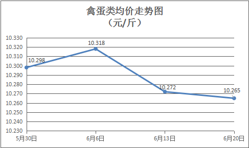 禽蛋类商品价格窄幅盘整。本周所监测的6种禽蛋类商品价格波动情况为3涨2跌1平,综合零售均价为10.265元/斤,环比下降0.06%。其中:白条鸡、白条鸭零售均价分别为每斤18.91元、14.26元,环比分别上涨0.37%、上涨0.71%;红壳鸡蛋、鸭蛋零售均价分别为每斤6.28元、7.33元,环比分别下降2.48%、上涨0.83%。