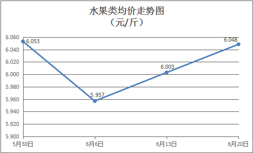 水果类商品价格总体略涨。本周所监测的6种水果商品价格波动情况为4涨1跌1平,综合零售均价为6.048元/斤,环比上涨0.75%。其中橙子、香蕉、西瓜零售均价分别为每斤5.73元、3.36元、2.74元,环比分别上涨1.24%、上涨1.20%、下降1.08%。