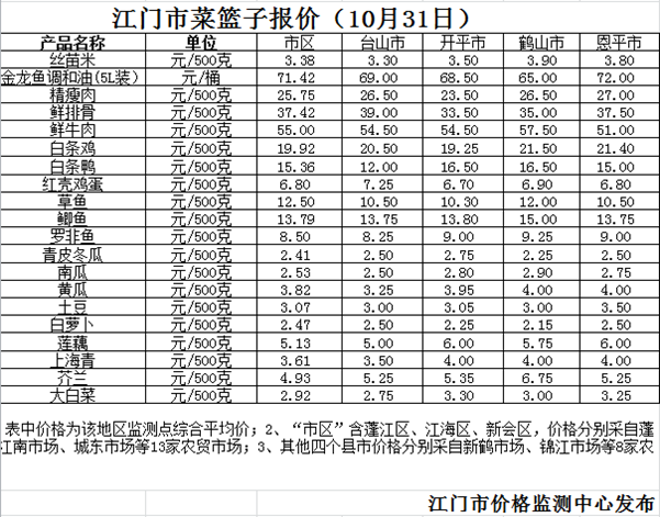 据本市21家农贸市场监测数据显示,本周(2022年10月25日至10月31日,下同)市场上各类“菜篮子”商品供应充足,所监测的7大类“菜篮子”商品价格4涨2跌1平。其中:粮食类商品价格平稳,食用油、肉蛋类、水产类商品价格总体略涨,家禽类、蔬果类商品价格有所下降。