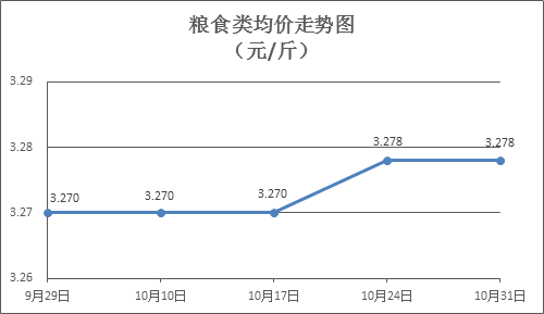粮食类商品价格平稳。本周所监测的6种粮食商品价格均持平,综合零售均价为3.278元/斤。其中:晚籼米、丝苗米、标准粉零售均价分别为每斤3.28元、3.51元、3.08元,环比均持平。