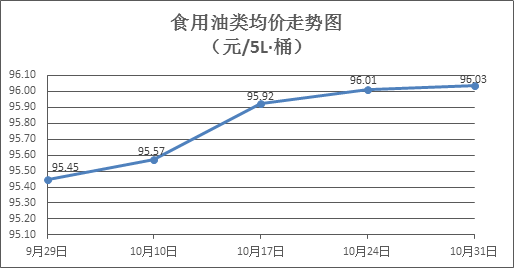 食用油类商品价格稳中微涨。本周所监测的9种食用油(5L装)商品价格波动情况为2涨7平,综合零售均价为96.03元/桶,环比上涨0.02%。其中:金龙鱼花生油、玉米油零售均价分别为每桶106.06元、73.82元,环比分别持平、上涨0.09%。