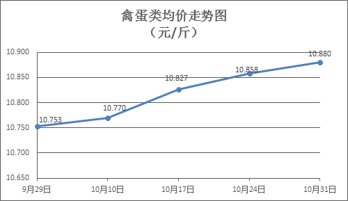 蛋类商品价格总体略涨。本周所监测的6种禽蛋类商品价格波动情况为4涨1跌1平,综合零售均价为10.880元/斤,环比上涨0.20%。其中:白条鸡、白条鸭零售均价分别为每斤20.34元、15.15元,环比分别持平、下降1.11%;红壳鸡蛋、鸭蛋零售均价分别为每斤6.86元、7.48元,环比分别上涨0.88%、上涨0.40%。