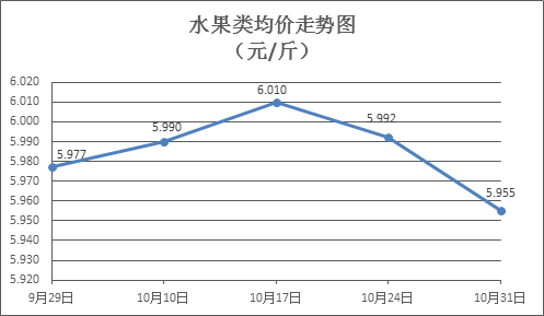 水果类商品价格稳中有降。本周所监测的6种水果商品价格波动情况为3跌3平,综合零售均价为5.955元/斤,环比下降0.61%。其中橙子、葡萄、梨零售均价分别为每斤6.48元、11.39元、5.11元,环比分别下降1.67%、持平、下降1.54%。