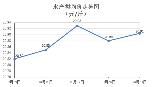 水产类商品价格窄幅盘整。本周所监测的10种水产商品价格波动情况为4涨2跌4平,综合均价为20.91元/斤,环比上涨0.13%。其中:草鱼、鳙鱼、罗非鱼、基围虾零售均价分别为每斤11.54元、10.96元、8.71元、38.19元,环比分别持平、上涨0.18%、下降0.23%、上涨0.61%。
