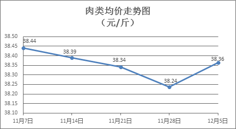 肉类商品价格总体略涨。本周所监测的8种肉类商品价格波动情况为6涨1跌1平,综合零售均价为38.36元/斤,环比上涨0.33%。其中:排骨、精瘦肉、有皮上肉、牛肉零售均价分别为每斤35.94元、25.12元、21.11元、54.90元,环比分别上涨0.93%、上涨0.08%、上涨1.20%、上涨0.44%。