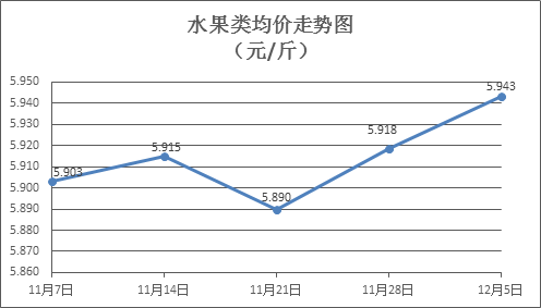 水果类商品价格小幅盘升。本周所监测的6种水果商品价格波动情况为4涨2跌,综合零售均价为5.943元/斤,环比上涨0.42%。其中橙子、苹果、梨零售均价分别为每斤6.43元、6.98元、4.90元,环比分别上涨0.94%、下降0.14%、上涨0.62%。