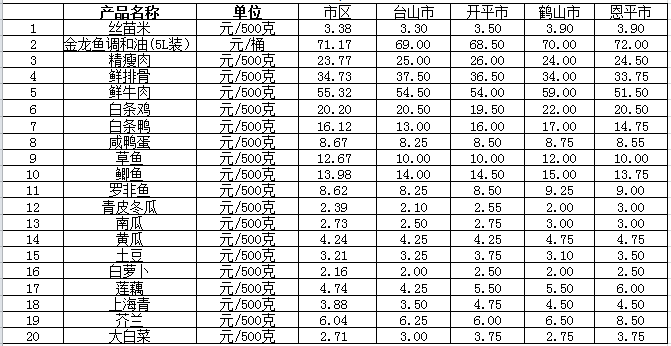 说明:1、表中价格为该地区监测点综合平均价;2、“市区”含蓬江区、江海区、新会区,价格分别采自蓬江市场、江南市场、城东市场等13家农贸市场;3、其他四个县市价格分别采自新华市场、锦江市场等8家农贸市场。