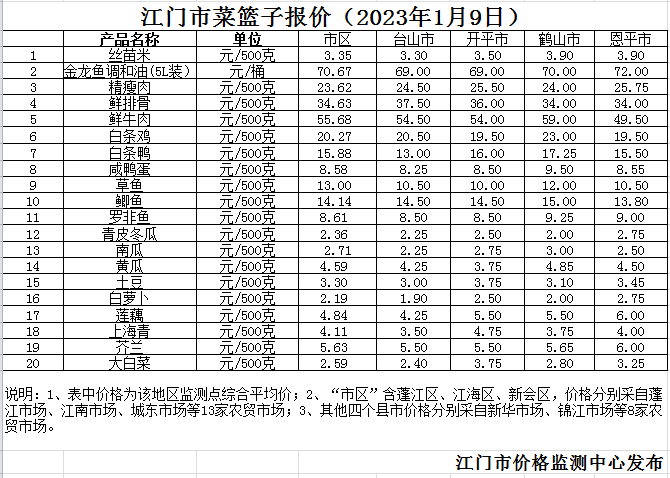 据本市21家农贸市场监测数据显示, 2022年12月27日至1月9日(下同)市场上各类“菜篮子”商品供应充足,所监测的7大类“菜篮子”商品价格2涨5跌。其中:粮油类、水果类商品价格稳中微涨,肉禽蛋类、蔬菜类、水产类商品价格有所微降。