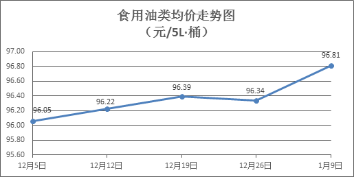 食用油类商品价格有所回升。本周所监测的9种食用油(5L装)商品价格波动情况为5涨2跌2平,综合零售均价为96.81元/桶,环比上涨0.47%。其中:鲁花花生油、菜籽油零售均价分别为每桶159.10元、76.92元,环比分别上涨0.14%、上涨4.19%。