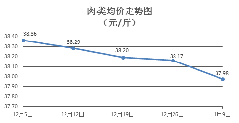 肉类商品价格有所回调。本周所监测的8种肉类商品价格波动情况为2涨6跌,综合零售均价为37.98元/斤,环比下降0.45%。其中:排骨、精瘦肉、有皮上肉、牛肉零售均价分别为每斤35.06元、24.37元、20.14元、54.86元,环比分别下降0.20%、上涨0.12%、下降1.42%、下降0.42%。