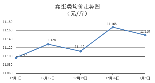 禽蛋类商品价格窄幅盘整。本周所监测的6种禽蛋类商品价格波动情况为3涨2跌1平,综合零售均价为11.150元/斤,环比下降0.03%。其中:白条鸡、白条鸭零售均价分别为每斤20.47元、15.66元,环比分别持平、上涨0.45%;白壳鸡蛋、鸭蛋零售均价分别为每斤7.25元、7.84元,环比分别下降0.55%、上涨0.38%。