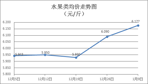 水果类商品价格升降互现。本周所监测的6种水果商品价格波动情况为3涨3跌,综合零售均价为6.177元/斤,环比上涨1.20%。其中苹果、葡萄、梨零售均价分别为每斤7.13元、11.98元、5.57元,环比分别上涨1.86%、下降0.66%、上涨7.32%。