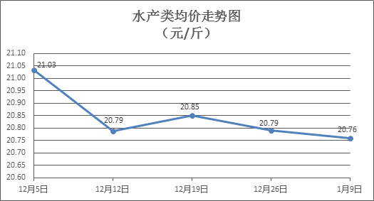 水产类商品价格稳中微降。本周所监测的10种水产商品价格波动情况为6涨4跌,综合均价为20.76元/斤,环比下降0.17%。其中:草鱼、鲢鱼、鲈鱼、基围虾零售均价分别为每斤11.71元、9.17元、20.00元、37.94元,环比分别上涨1.83%、下降3.47%、下降0.89%、上涨0.16%。