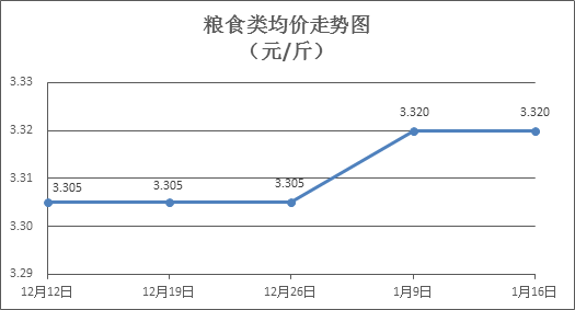 粮食类商品价格平稳。本周所监测的6种粮食商品价格均持平,综合零售均价为3.320元/斤,环比均持平。其中:晚籼米、丝苗米、富强粉零售均价分别为每斤3.31元、3.52元、3.42元,环比均持平。