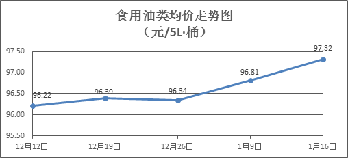 食用油类商品价格整体微涨。本周所监测的9种食用油(5L装)商品价格波动情况为8涨1跌,综合零售均价为97.32元/桶,环比上涨0.52%。其中:鲁花花生油、金龙鱼调和油零售均价分别为每桶159.26元、70.50元,环比分别上涨0.10%、上涨0.30%。