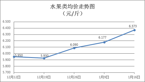 水果类商品价格继续上涨。本周所监测的6种水果商品价格波动情况为5涨1跌,综合零售均价为6.373元/斤,环比上涨3.18%。其中苹果、葡萄、梨零售均价分别为每斤7.18元、12.33元、5.87元,环比分别上涨0.70%、上涨2.92%、上涨5.39%。