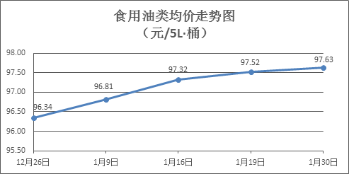 食用油类商品价格稳中微涨。本周所监测的9种食用油(5L装)商品价格波动情况为5涨1跌3平,综合零售均价为97.63元/桶,节前比上涨0.11%。其中:鲁花花生油、金龙鱼调和油零售均价分别为每桶159.50元、71.18元,节前比分别持平、上涨0.31%。