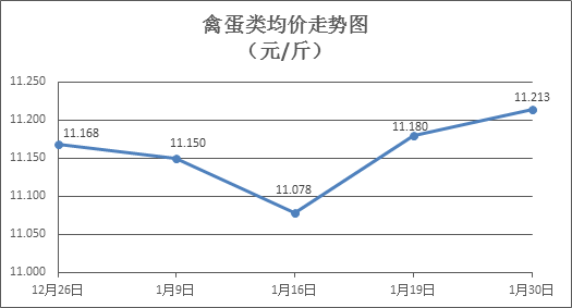 禽蛋类商品价格总体略涨。本周所监测的6种禽蛋类商品价格波动情况为3涨1跌2平,综合零售均价为11.213元/斤,节前比上涨0.30%。其中:白条鸡、白条鸭零售均价分别为每斤20.74元、15.75元,节前比分别上涨0.19%、上涨0.45%;白壳鸡蛋、鸭蛋零售均价分别为每斤7.16元、7.84元,节前比分别下降0.14%、持平。