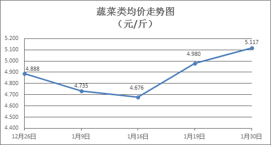 据本市21家农贸市场监测数据显示,本周(1月30日)与春节前(1月19日)相比,市场上各类“菜篮子”商品供应充足,所监测的7大类“菜篮子”商品价格6涨1平。其中:粮食类商品价格平稳,食用油类、肉禽蛋类、蔬果类、水产类商品价格总体略涨。