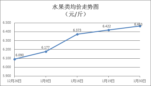 水果类商品价格以涨为主。本周所监测的6种水果商品价格波动情况为4涨2跌,综合零售均价为6.463元/斤,节前比上涨0.65%。其中苹果、葡萄、梨零售均价分别为每斤7.16元、12.50元、6.14元,节前比分别上涨0.28%、上涨0.64%、上涨2.33%。