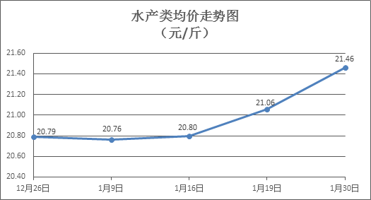 水产类商品价格小幅上涨。本周所监测的10种水产商品价格波动情况为8涨2平,综合均价为21.46元/斤,节前比上涨1.94%。其中:草鱼、鲫鱼、罗非鱼、基围虾零售均价分别为每斤11.57元、14.47元、8.82元、41.11元,节前比分别上涨0.26%、上涨1.54%、上涨2.32%、上涨4.08%。