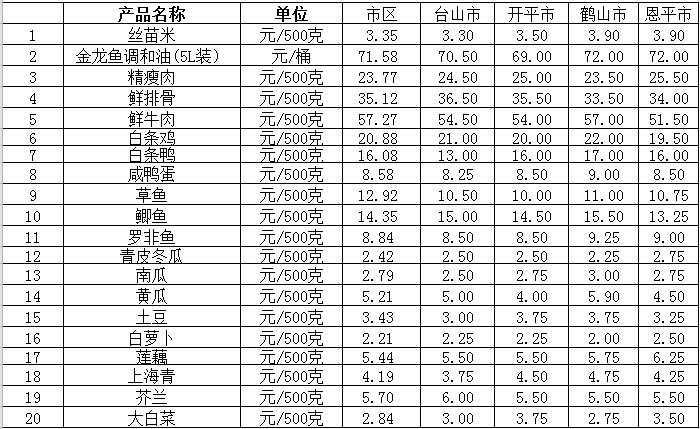 说明:1、表中价格为该地区监测点综合平均价;2、“市区”含蓬江区、江海区、新会区,价格分别采自蓬江市场、江南市场、城东市场等13家农贸市场;3、其他四个县市价格分别采自新华市场、锦江市场等8家农贸市场。
