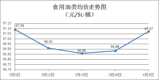 食用油类商品价格总体微升。本周所监测的9种食用油(5L装)商品价格浮动情况为5涨3跌1平,综合零售均价为97.07元/桶,环比上涨0.19%。其中:胡姬花花生油、大豆油零售均价分别为每桶147.50元、61.39元,环比分别上涨1.15%、下降0.23%。