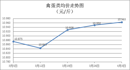 禽蛋类商品价格升降互现。本周所监测的6种禽蛋类商品价格波动情况为3涨2跌1平,综合零售均价为10.963元/斤,环比上涨0.12%。其中:白条鸡、白条鸭零售均价分别为每斤19.77元、15.38元,环比分别上涨0.15%、上涨0.07%;白壳鸡蛋、鸭蛋零售均价分别为每斤6.99元、7.82元,环比分别上涨1.16%、下降0.38%。