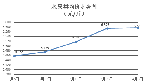 水果类商品价格窄幅盘整。本周所监测的6种水果商品价格波动情况为3涨2跌1平,综合零售均价为6.577元/斤,环比上涨0.03%。其中苹果、香蕉、橙子零售均价分别为每斤7.14元、3.18元、6.46元,环比分别上涨0.14%、上涨0.63%、下降0.46%。