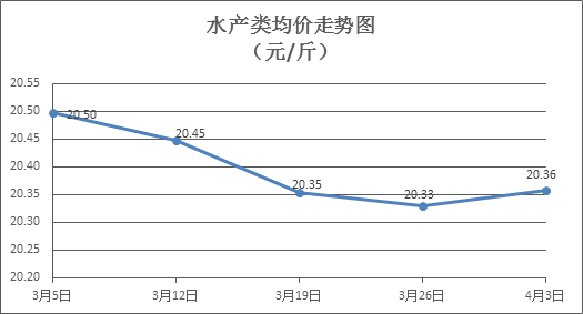 水产类商品价格震荡偏强。本周所监测的10种水产商品价格波动情况为6涨3跌1平,综合均价为20.36元/斤,环比上涨0.13%。其中:草鱼、鲫鱼、鳙鱼、罗非鱼、基围虾零售均价分别为每斤10.91元、13.96元、10.12元、8.43元、38.43元,环比分别上涨0.28%、上涨0.87%、下降0.10%、上涨0.48%、上涨0.37%。