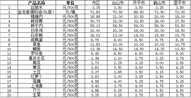 说明:1、表中价格为该地区监测点综合平均价;2、“市区”含蓬江区、江海区、新会区,价格分别采自蓬江市场、江南市场、城东市场等13家农贸市场;3、其他四个县市价格分别采自新华市场、锦江市场等8家农贸市场。