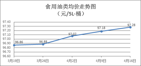 食用油类商品价格总体微升。本周所监测的9种食用油(5L装)商品价格波动情况为7涨1跌1平,综合零售均价为97.28元/桶,环比上涨0.10%。其中:金龙鱼花生油、金龙鱼调和油零售均价分别为每桶105.74元、71.83元,环比分别上涨0.28%、上涨0.17%。