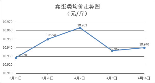 家禽类商品价格略有小涨。本周所监测的6种禽蛋类商品价格波动情况为3涨2跌1平,综合零售均价为10.940元/斤,环比上涨0.03%。其中:白条鸡、白条鸭零售均价分别为每斤20.00元、15.32元,环比分别上涨0.60%、上涨0.72%;白壳鸡蛋、鸭蛋零售均价分别为每斤6.90元、7.82元,环比分别下降0.58%、持平。