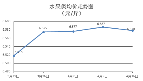水果类商品价格升降互现。本周所监测的6种水果商品价格波动情况为3涨2跌1平,综合零售均价为6.578元/斤,环比下降0.13%。其中苹果、香蕉、葡萄零售均价分别为每斤7.22元、3.24元、13.00元,环比分别上涨0.84%、持平、下降0.31%。