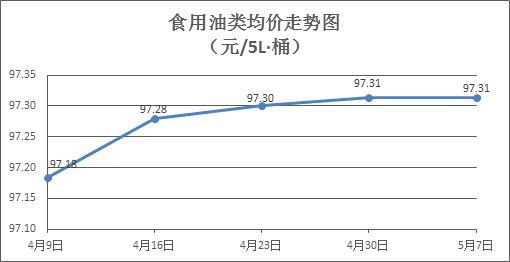 食用油类商品价格微幅调整。本周所监测的9种食用油(5L装)商品价格波动情况为3涨2跌4平,综合零售均价为97.31元/桶,环比持平。其中:金龙鱼花生油、玉米油零售均价分别为每桶106.43元、76.21元,环比分别下降0.06%、上涨0.12%。