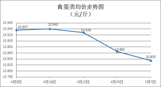 禽蛋类商品价格略有下浮。本周所监测的6种禽蛋类商品价格波动情况为5跌1平,综合零售均价为10.835元/斤,环比下降0.28%。其中:白条鸡、白条鸭零售均价分别为每斤19.59元、15.08元,环比分别下降0.25%、下降0.46%;白壳鸡蛋、鸭蛋零售均价分别为每斤6.89元、7.77元,环比分别下降0.29%、持平。